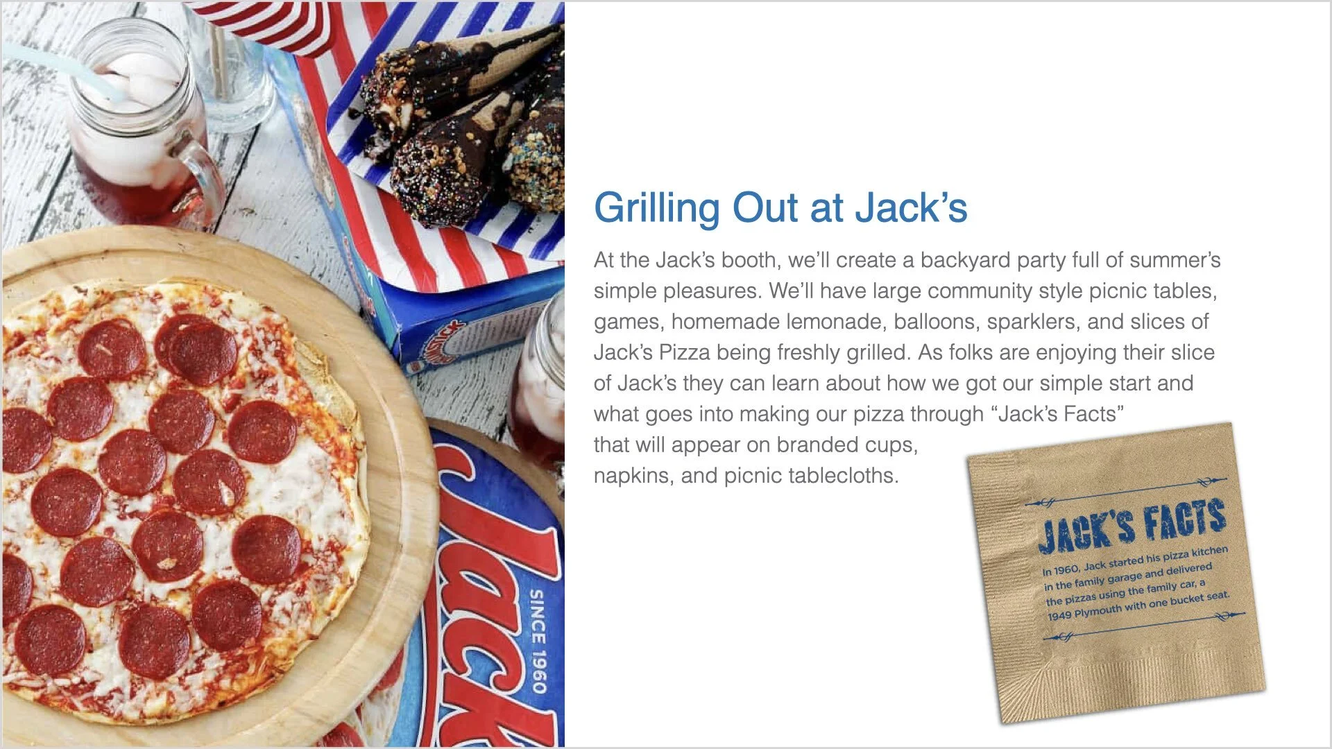 At the Jack’s Pizza booth, we recreated a simple family backyard party for fair-goers where Jack’s Pizza was grilled and served with cups and napkins brought onto tablecloths all branded with “Jack’s Facts”: learning Jack’s Pizza’s heritage and what goes into a delicious Jack’s Pizza. Throughout the booth space were fun family games, fresh lemonade, and balloons to remember the simple pleasures of family summer fun.